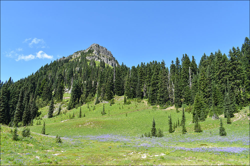 Bluebells and other wildflowers bloom under Yakima Peak. Yakima Peak rises to 6,226-ft (1,898 m) and overlooks Tipsoo Lake, just located just inside the eastern boundary of Mount Rainier National Park. Mount Rainier is the highest peak of the Cascade volcanoes, rising 14,411 feet above sea level. It is also considered one of the most dangerous volcanoes in North America. Mount Rainier National Park Washington. (11 Aug. 2020; Nathanael Miller)