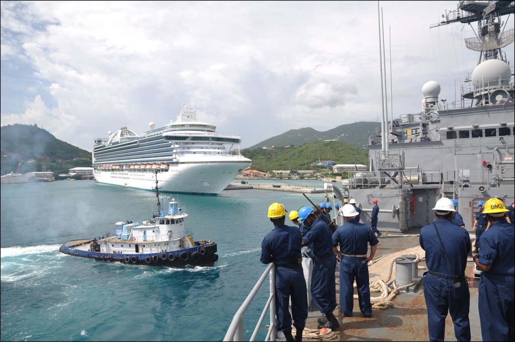 The St. Thomas pilot came aboard right on schedule. Shortly afterward, the tugs approached and began to tie onto Ponce. The plan was for the tugs to back us into place, allowing us to tie up on our starboard side. The other side of the pier we were aiming for was occupied by the titanic MV Ruby Princess, one of Princess Cruise’s newer ships at the time.