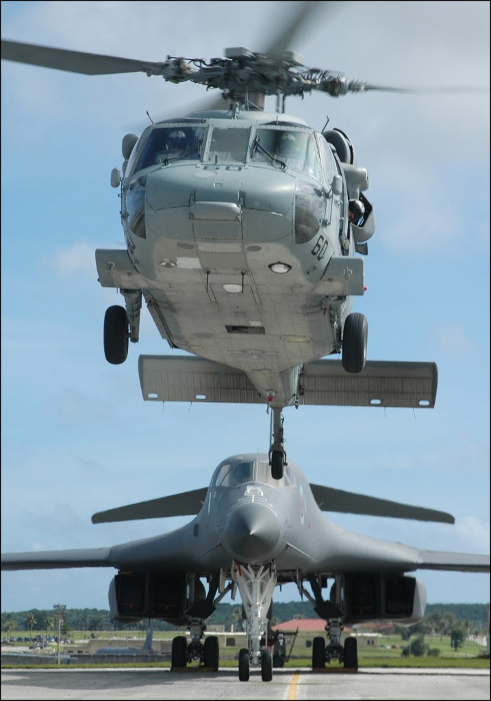 An MH-60S “Knight Hawk” helicopter belonging to the Sea Knights of Navy Helicopter Sea Combat Squadron 25 (HSC-25) maneuvers over the taxiway of Andersen Air Force Base on the U.S. territory of Guam. Behind the “Knight Hawk” is a B-1B “Lancer” bomber belonging to the Air Force’s 34th Bomb Squadron, which is deployed to Andersen from its home base of Ellsworth Air Force Base in South Dakota. (U.S. Navy photo by PH2 Nathanael Miller, 16 November 2005)