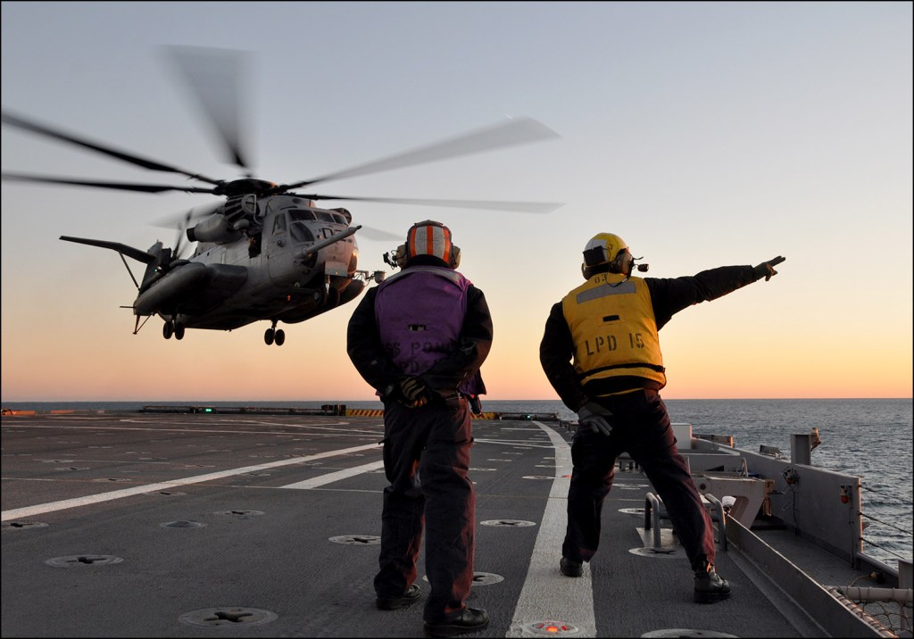 111201-N-YX169-174 ATLANTIC OCEAN (Dec. 1, 2011) – Aviation Boatswain’s Mate (Fuels) 2nd Class Robert De Soto, left, watches as Aviation Boatswain’s Mate (Handler) Airman Michael Babers directs a CH-53E Super Stallion from Marine Heavy Helicopter Squadron 461 (HMH 461) as it takes off from the flight deck of the amphibious transport dock USS Ponce (LPD 15) during an evening of training flights. (U.S. Navy photo by MC1 Nathanael Miller, 1 December 2011)