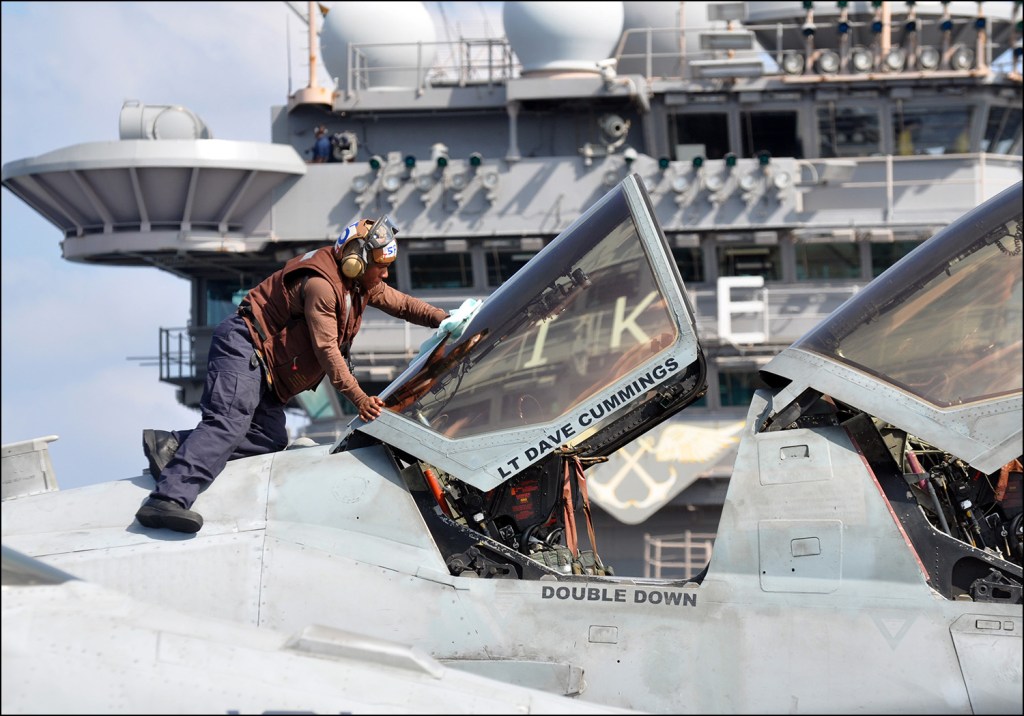Airman Jay Abraham, assigned to the Patriots of Electronic Attack Squadron 140 (VAQ 140), cleans the canopy of an EA-6B Prowler aboard Nimitz-class aircraft carrier USS Dwight D. Eisenhower (CVN 69). (U.S. Navy photo by MC1 Nathanael Miller, 25 November 2012)