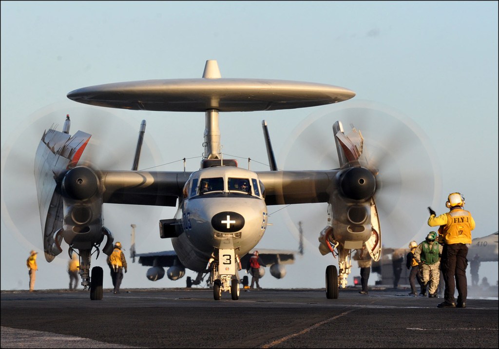 An Aviation Boatswain’s Mate (Handling) directs an E-2C Hawkeye from the Bluetails of Carrier Airborne Early Warning Squadron 121 (VAW 121) to the catapults aboard Nimitz-class aircraft carrier USS Dwight D. Eisenhower (CVN 69). (U.S. Navy photo by MC1 Nathanael Miller, 5 December 2012)