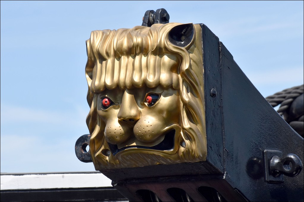 The “cat head” is a large beam jutting from the bow of an old sailing vessel that was used to support the raising and lowering of the anchor. Cat heads were often finished by carving an actual cat’s head on the end. This cat head is aboard the frigate USS Constitution. Launched in 1797, Constitution entered service (“commissioned” in today’s terminology) in 1798. She is the oldest commissioned warship afloat in the world, and is, along with the World War II carrier USS Enterprise (CV 6), one of the two most decorated surface ships in Navy history. Today she is permanently berthed as a living Navy museum at the Boston Navy Yard. The ship has seen four centuries (18th, 19th, 20th, 21st), and served under 44 of the 45 Presidents of the United States. Charlestown, Massachusetts. (Nathanael Miller, 21 July 2018)