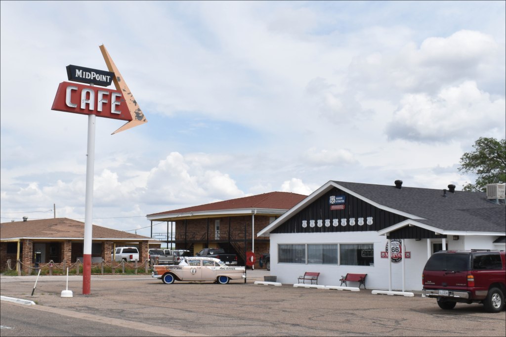 Adrian was founded in 1900 as a stop along the same Rock Island Railroad that led to Glenrio’s birth in 1903. Adrian also experienced a steeply painful decline when I-40 bypassed it and Route 66 was largely decommissioned. However, Adrian managed to survive as a tiny farming community of less than 200 people. Adrian also found some economic support from a small, nostalgia-based tourist industry centering on the fact that Adrian sits on the exact geographic midpoint for old Route 66. In fact, the still-functioning Midpoint Café is built astride that magical point (1,139 miles to Los Angeles; 1,139 miles to Chicago).