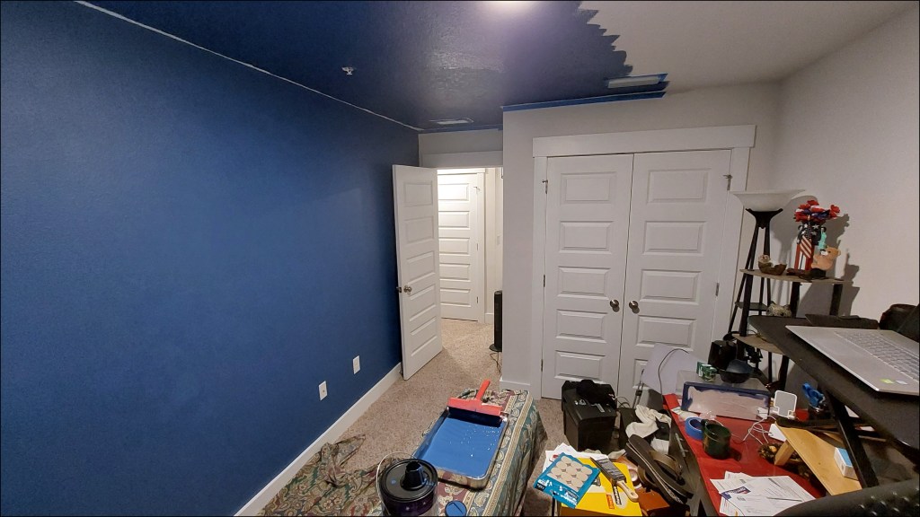 I had to take a few extra days and paint half the ceiling and part of another wall so the video background will be a smooth color. You can see the room’s shape, but it’s all a consistent color.