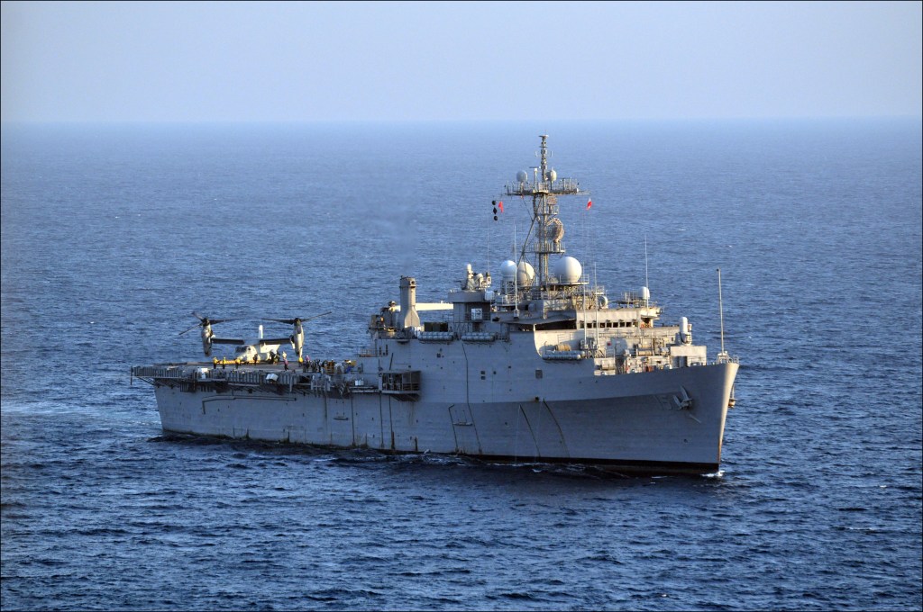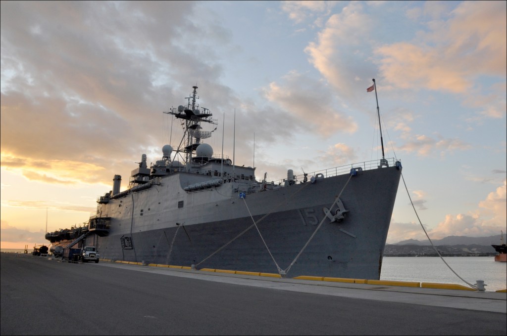 I was married back in 2010, and my family and I went on house-hunting leave from Maryland down to Norfolk, Virginia, in May 2010. On a whim, I swung out to the Naval Station Norfolk waterfront to see if LPD 15 was in. I got lucky; I saw an Austin-class ship moored stern-in on her starboard side at the far end of Pier 5 among several modern Arleigh Burke-class destroyers. This positioning meant I could see the ship’s helicopter hangar; the hangar door was closed, and it bore a painting of a winged lion straddling the globe with a stylized “15” next to the lion. It didn’t take Sherlock Holmes’ genius to work out I was looking at LPD 15…whatever the hell her name was.