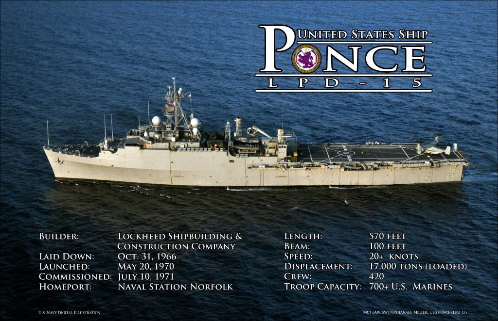 USS Ponce (LPD 15) was an obscure, ignored, often maligned dump truck of a ship, but she never quit. Through bad times and good, something in her wouldn’t give up. She’s passing into history now, but her fate is not to be forgotten as an unwanted footnote somewhere in the Pentagon. She might never be celebrated like some of the legendary ships that have defended our nation, but she won’t ever fade into obscurity. There are too many of us whose lives were forever changed and linked together when she welded us into the anchor chain of her story.