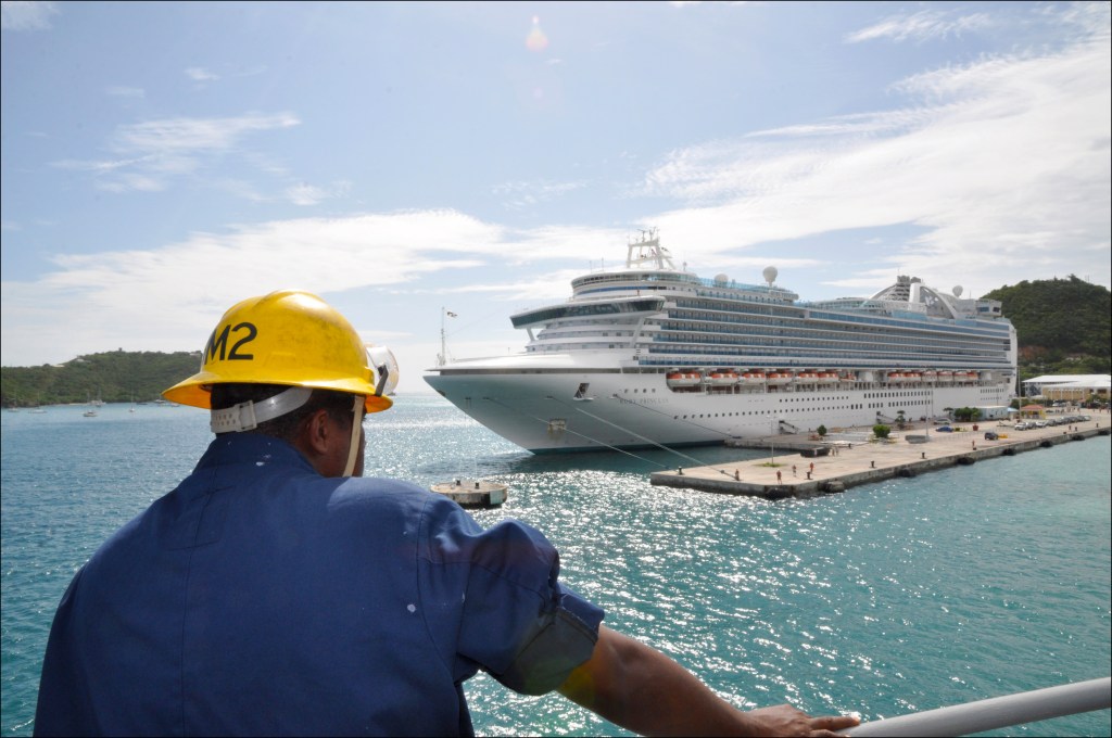 The St. Thomas pilot came aboard right on schedule. Shortly afterward, the tugs approached and began to take on the lines from Ponce. The plan was for the tugs to back us into place, allowing us to tie up on our starboard side. The other side of the pier we were aiming for was occupied by the titanic MV Ruby Princess, one of Princess Cruise’s newer ships at the time.