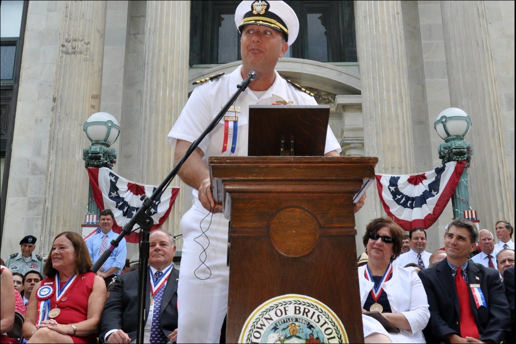 Ponce returned from a nine-month deployment in early 2011. We had a few weeks of downtime for the crew to take leave before we got moving again. The ship’s first major operation would be taking Naval Academy midshipmen on their summer cruise, a summer cruise we began by sailing to Bristol for the big, brash, boisterous American birthday bash. Sadly the ship would be unable to tie up at a pier, owing to her draft, so we couldn’t give public tours. However, our crew would be marching in the parade, led by our Executive Officer, while our commanding officer, the late and truly great Cmdr. Cole Hayes, would be a featured speaker prior to the parade’s kick-off.