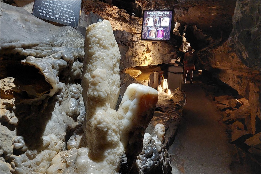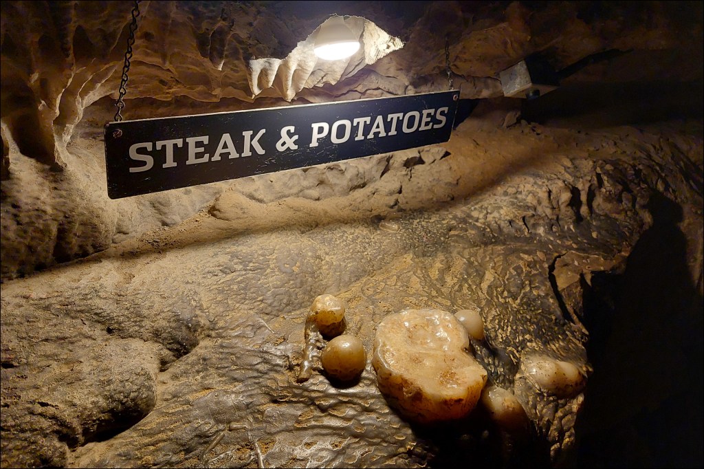 The basic tour is about a mile round-trip from the elevator to the falls and back. Along the way, you’ll see large formations like the Cactus and Candle, and the Leaning Tower. You’ll also be amused by smaller formations like the Steak and Potatoes…which look very much like their name suggests! However, these are living caves, meaning the flow and drip of water is still very much at work. The caves are growing, changing, and evolving. Today’s small Steak and Potatoes might well become towering crystalline columns dozens of feet high in a few million years (give or take a thousand years or so).