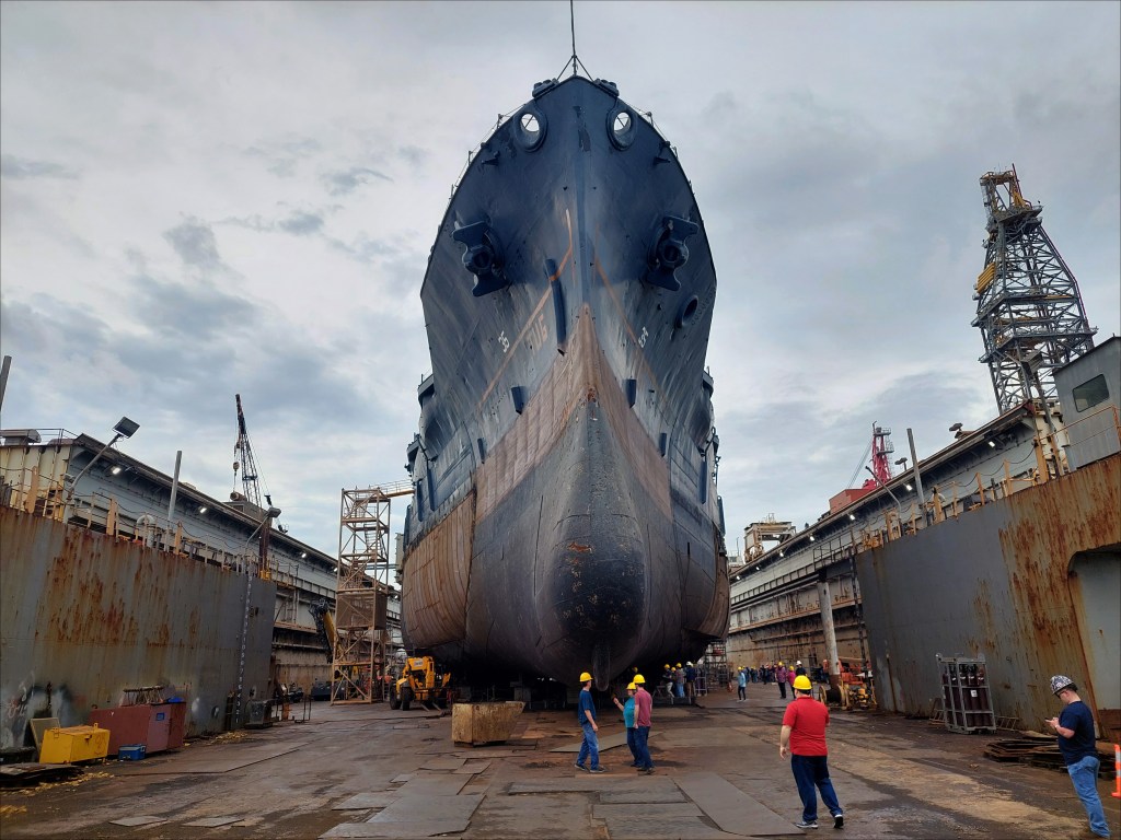 My first time at a dry dock was watching the island superstructure being lowered into place aboard the then-under-construction USS Gerald R. Ford (CVN 78) back in 2017 (https://sparks1524.com/2023/02/26/on-the-waterfront-a-fording-an-island/). My first time in a dry dock was at the Puget Sound Naval Shipyard in Bremerton, Washington in 2019. I was under the submarine USS Connecticut (SSN 22) during the testing of a hull-crawling robot for inspections. Being underneath the curving hull of the 353-foot-long, 8,000+ ton Connecticut was one thing.