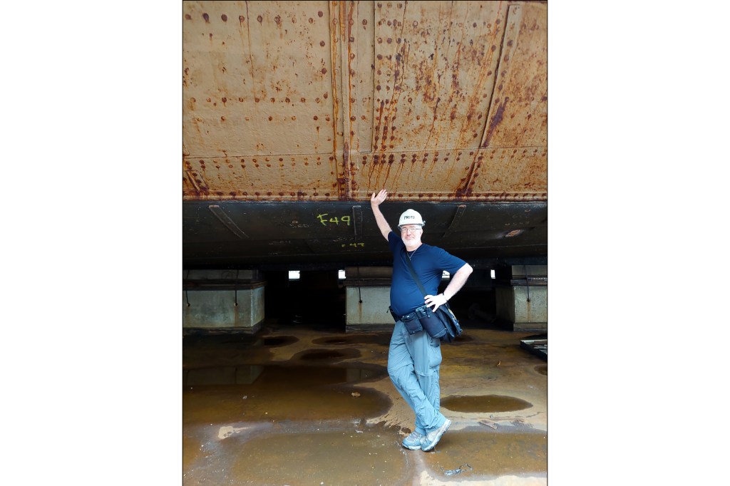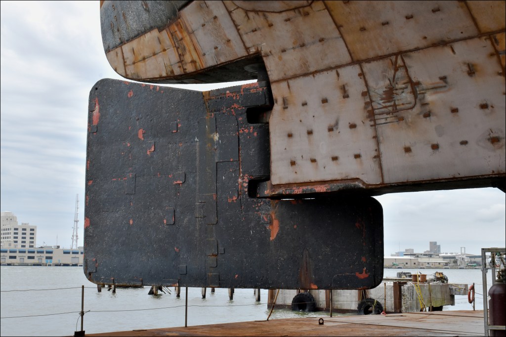 The restoration effort affords visitors more unique experiences than simply walking underneath this giant ship’s centerline to touch her hull. The removal of the highly corroded ‘torpedo blisters’ that were added in the 1920s (literally blisters that expanded the outer hull to provide a cushion softening the detonation of torpedoes) allows her original outer hull—and its riveted construction—to be seen. Visitors can even see and touch the ship’s keel, that mythic, central spine of all surface ships.